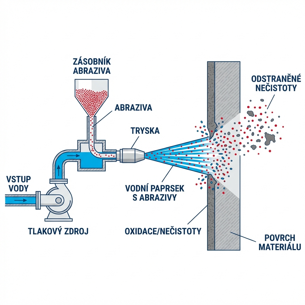 - Voda pod vysokým tlakem (typicky 150–300 MPa) je smíchána s abrazivními částicemi (skleněné kuličky, oxid hlinitý, garnet)