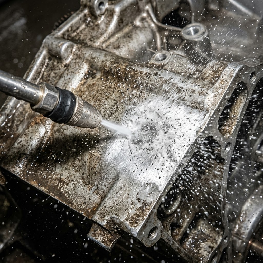 Při suchém pískování se abrazivní částice mohou zaklínit do pórů odlitku, závitů nebo olejových kanálků. Jejich následné uvolnění do olejového okruhu motoru je katastrofické. Při aquablastingu voda **mechanicky vyplavuje** uvolněné nečistoty i zbytky abraziva z povrchu průběžně během procesu — riziko kontaminace je tak výrazně nižší.